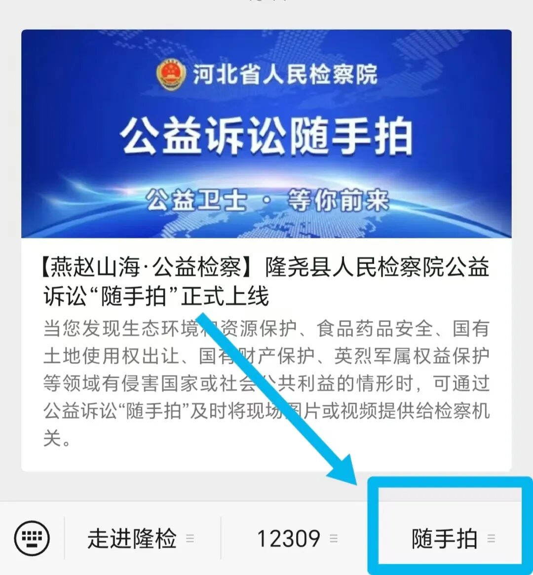 为进一步贯彻落实全省检察机关“燕赵山海·公益检察”专项监督要求,充分利用新媒体网络平台做好公益诉讼检察工作,拓展获取案件线索渠道,隆尧县人民检察院公益诉讼“随手拍”举报平台正式上线。