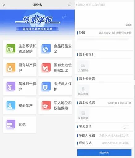 3.点击【线索举报】菜单,从列表中选择相应的公益诉讼领域,提交您的线索。支持文字、语音、照片、视频、定位等方式进行举报,并可选择实名或匿名举报。